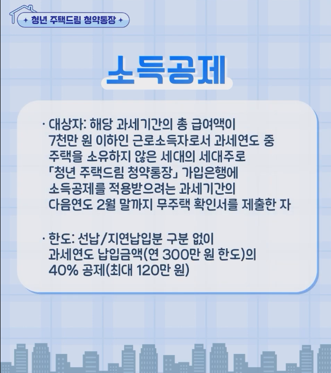 - ✔ 무주택 세대주 소득공제 가능: 청년주택드림청약통장 가입 시 최대 120만 원 소득공제