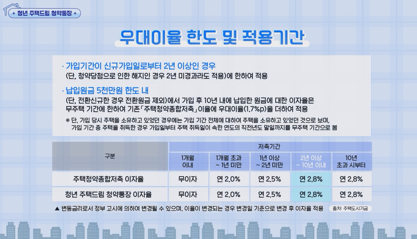 - ✔ 청년주택드림청약통장: 연 4.5% (우대금리 포함)