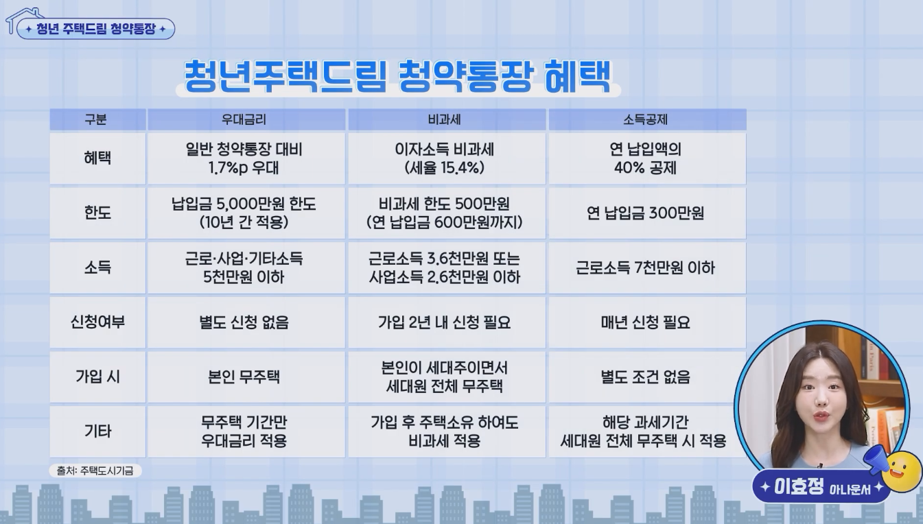 - ✔ 청년주택드림청약통장: 연 600만 원 한도 내 소득공제 + 이자소득 500만 원 비과세