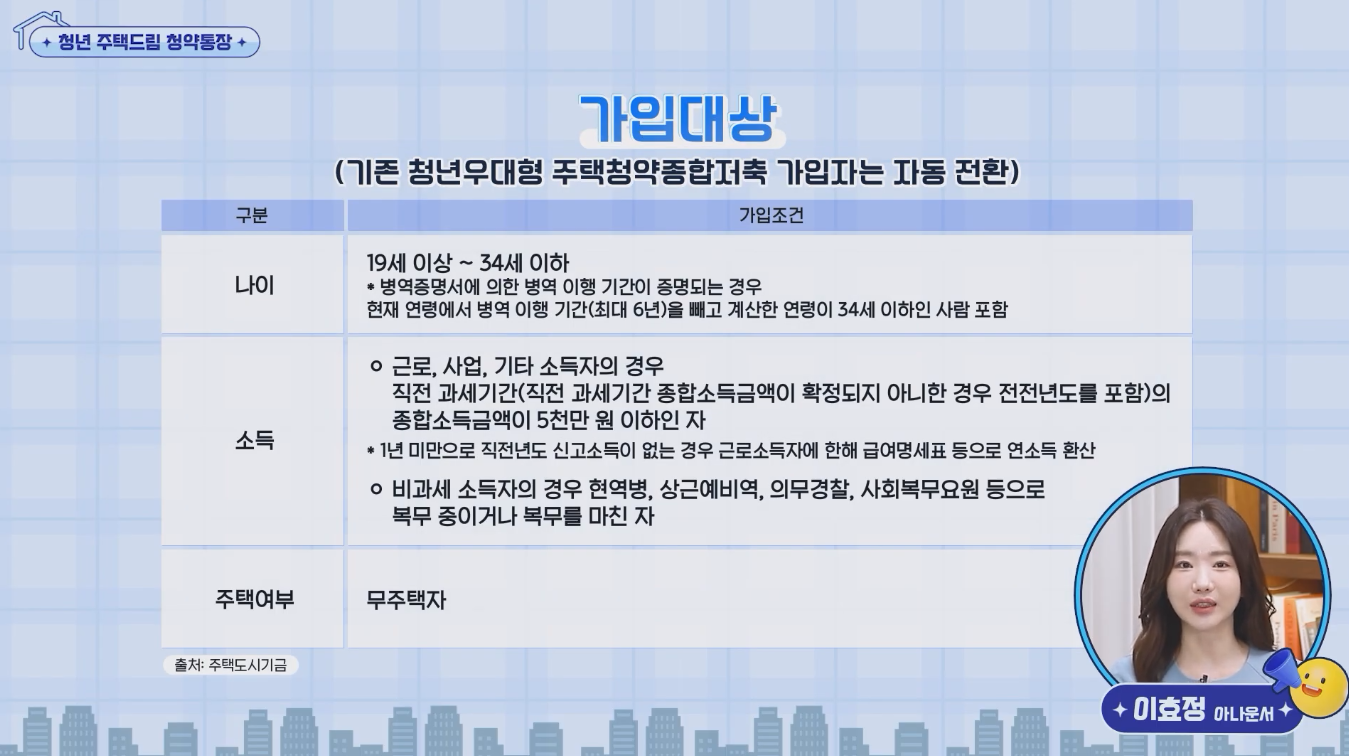 - ✔ 청년주택드림청약통장: 만 19세~34세, 무주택 청년 대상